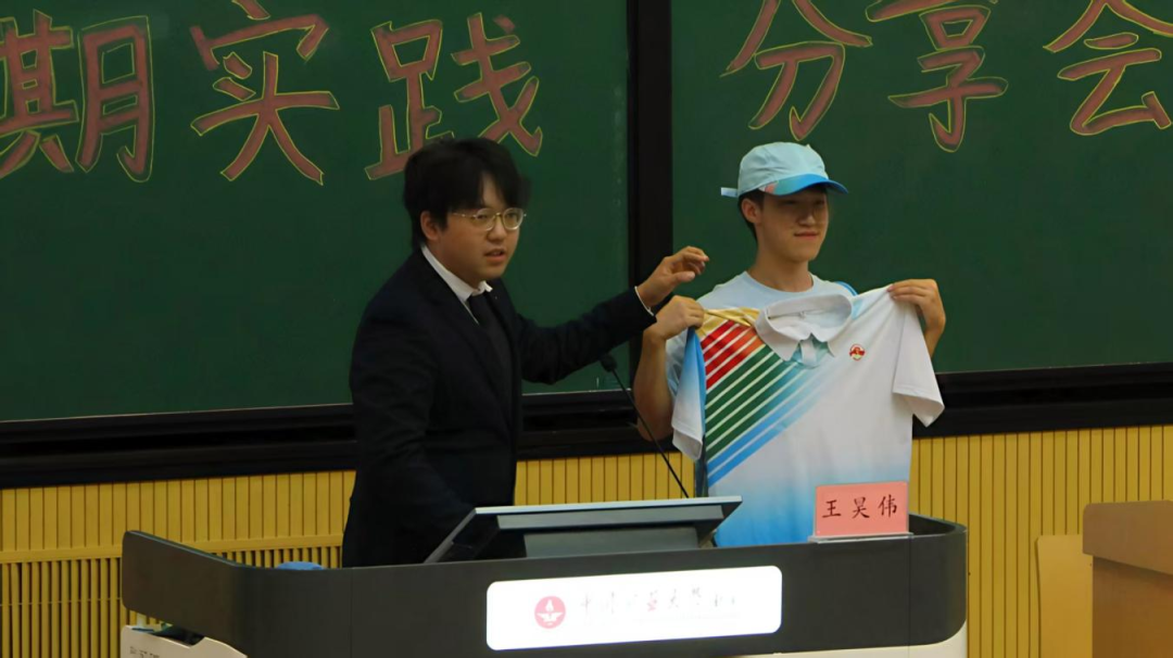 志愿者代表王昊伟向同学们分享志愿服务培训及彩排中的点点滴滴,展示纪念中国人民抗日战争暨世界反法西斯战争胜利80周年系列活动志愿服务专属服装,点燃了同学们对志愿服务的热情。通过参加此次志愿服务活动,他深深感受到历史的纵深感,坦言内心的震撼。鼓励同学们把每个微小的工作做好,为社会做出力所能及的贡献。