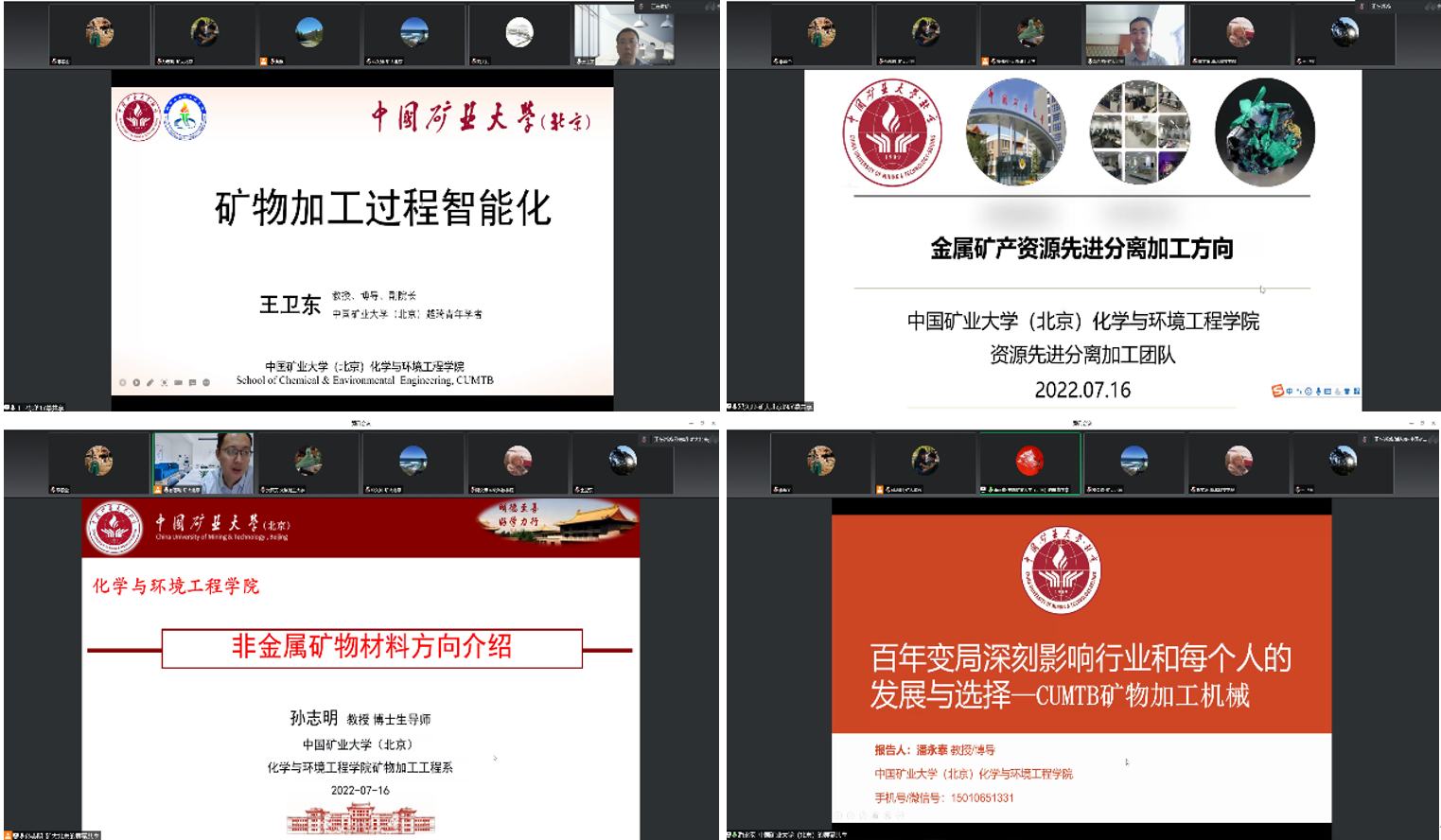 7月16日上午10:00,夏令营全体成员利用腾讯会议在线参加了矿物加工工程系精心安排的学术系列讲座,王卫东教授、邓久帅教授、孙志明教授和潘永泰教授分别从矿物加工过程智能化、金属矿产资源先进分离加工、非金属矿物材料和矿物加工机械四个方面介绍了矿物加工工程系学科方向。学术报告后参加夏令营的同学与各位教授在线进行了深入的交流探讨,各位老师从研究方向、项目成果、培养计划到科研生活等方面给出了详细回答。